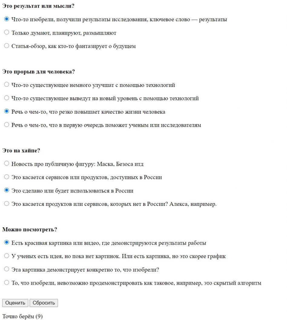 - кажется, что достаточно всего трёх градаций: берём, не берём и надо подумать, при этом неважно, сколько точно баллов набрала новость;