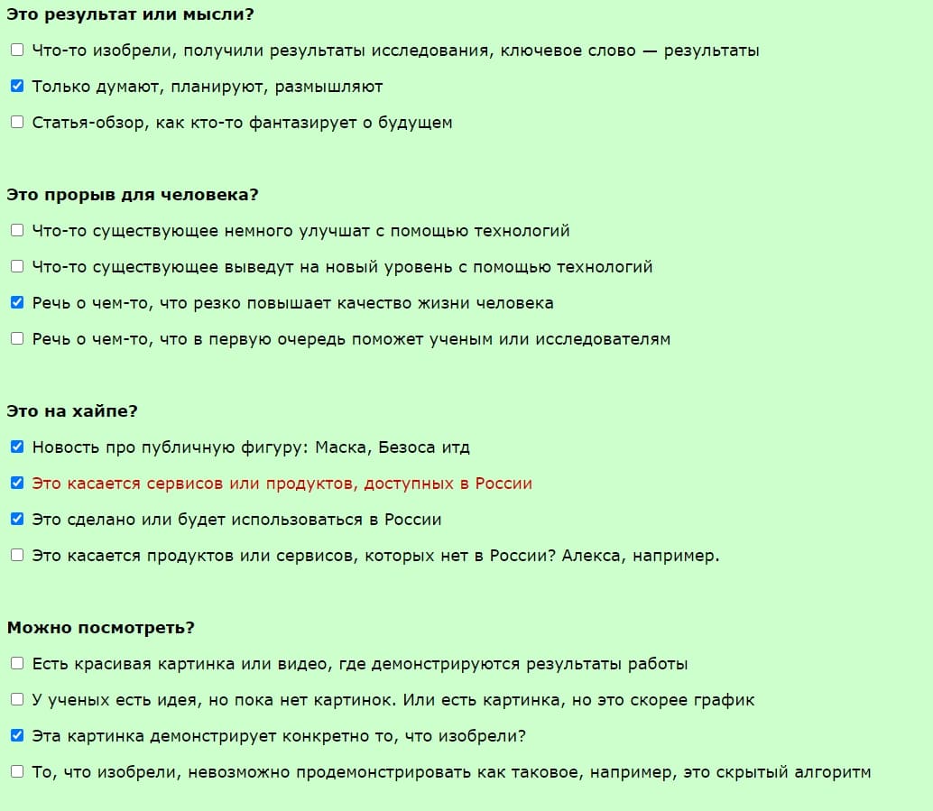 Ещё мы уменьшили количество градаций с результатами, чтобы было проще ориентироваться. Теперь сразу понятно, что если фон стал зелёным, то новость можно брать в работу, а если красным — то, скорее всего, нет.