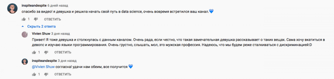 Если девушка мне напишет и попросит поддержки — я ей порекомендую посмотреть видео с моей историей и сосредоточиться на обучении. Мне кажется, работодатели перестали делить программистов на парней и девушек. Если ты хороший специалист — докажи и начинай работать.