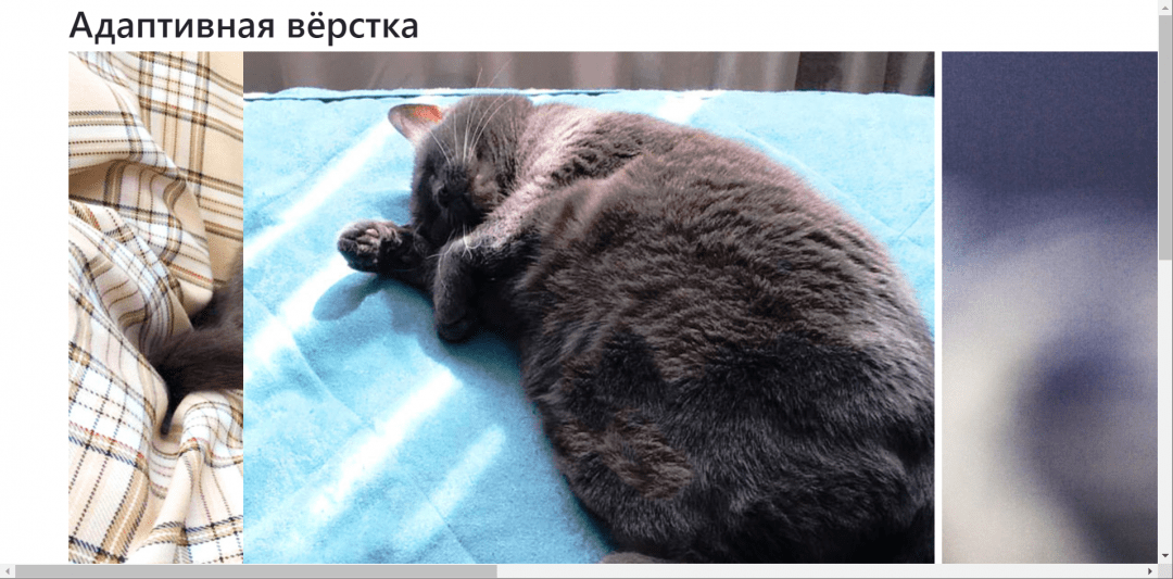 Чтобы на разных экранах картинки выглядели хорошо, давайте сделаем так, чтобы на средних экранах все коты были одного размера, а на маленьких — выстраивались одни под другими. Для этого изменим наш прошлый блок таким образом: