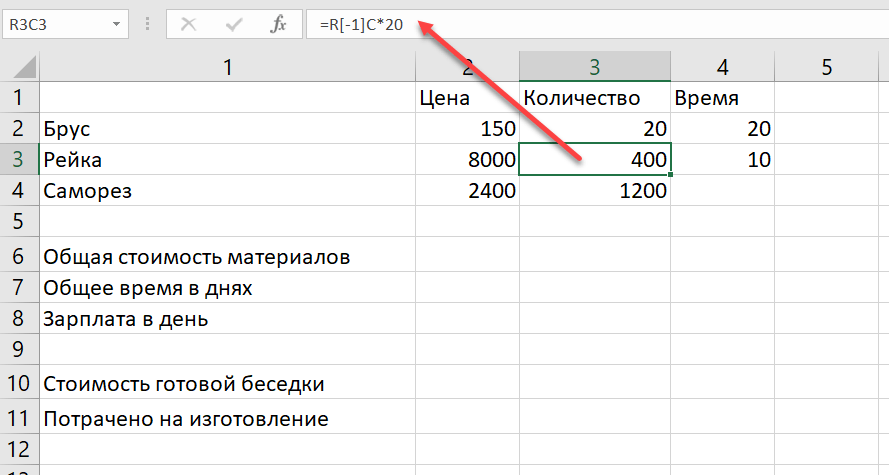 У нас количество стройматериала зависит от бруса, поэтому впишем только его, а остальное рассчитаем по формулам. Например, количество реек мы найдём так: умножим количество брусков на 20, как и написано в условиях. Время и стоимость для всех материалов точно так же посчитаем по формулам: