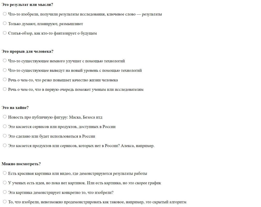 Самый простой способ решить эту задачу — сделать веб-страницу с вариантами ответов. Вы выбираете нужные и получаете ответ: стоит эту новость брать или нет.