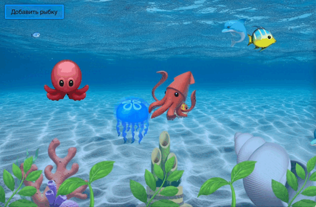 В веб-проекте «Делаем аквариум с разными обитателями» мы использовали анимацию для движения рыбок. С помощью свойства transform рыбки плывут из одной стороны аквариума в другую, затем разворачиваются, используя scaleX, и возвращаются обратно.