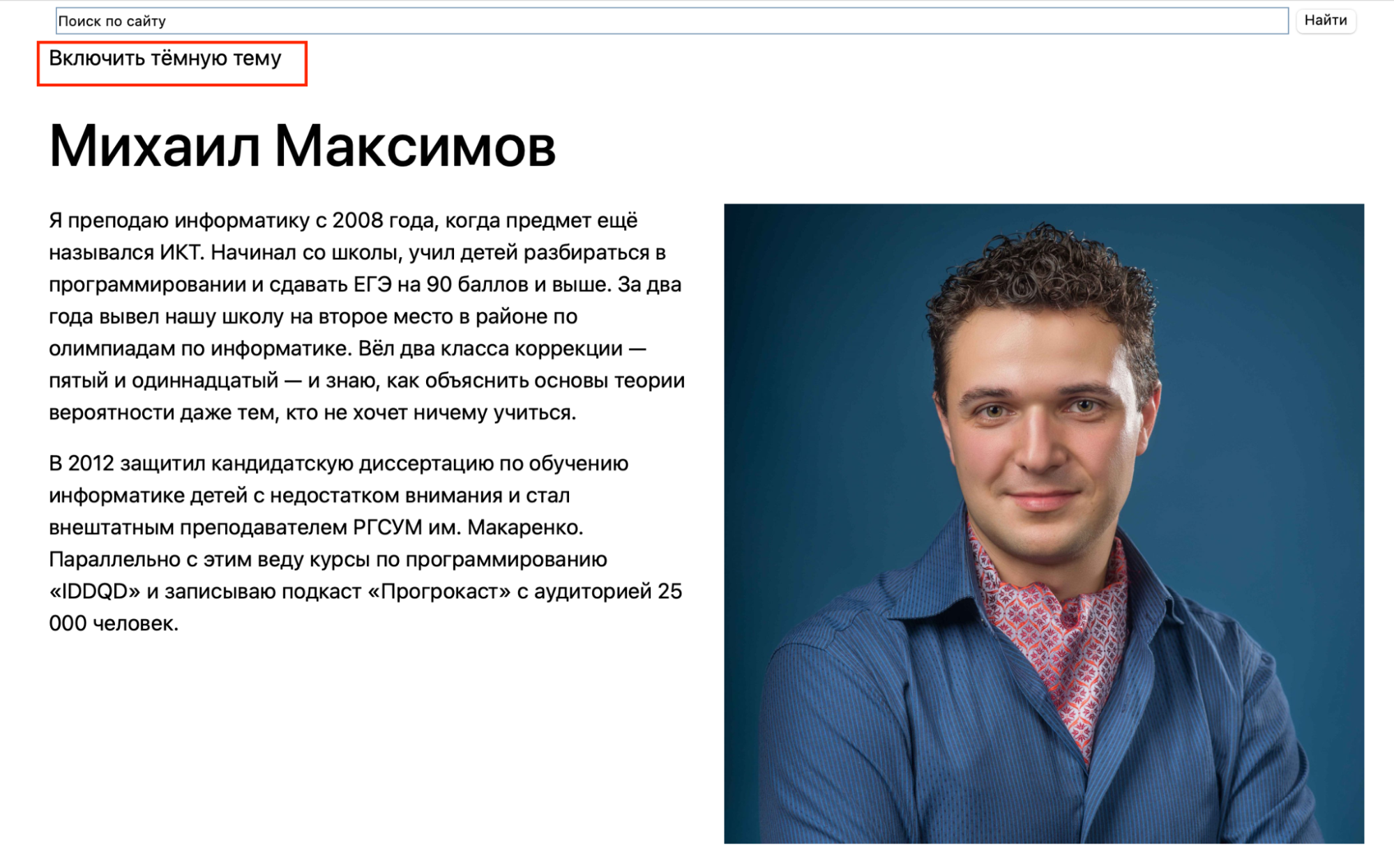 Этот способ работает только на одной странице, и после перезагрузки тему нужно переключать заново. В следующий раз сделаем апгрейд — научим сайт запоминать настройки и применять их ко всему сайту. А ещё подружим автопереключение с надписью на переключателе.