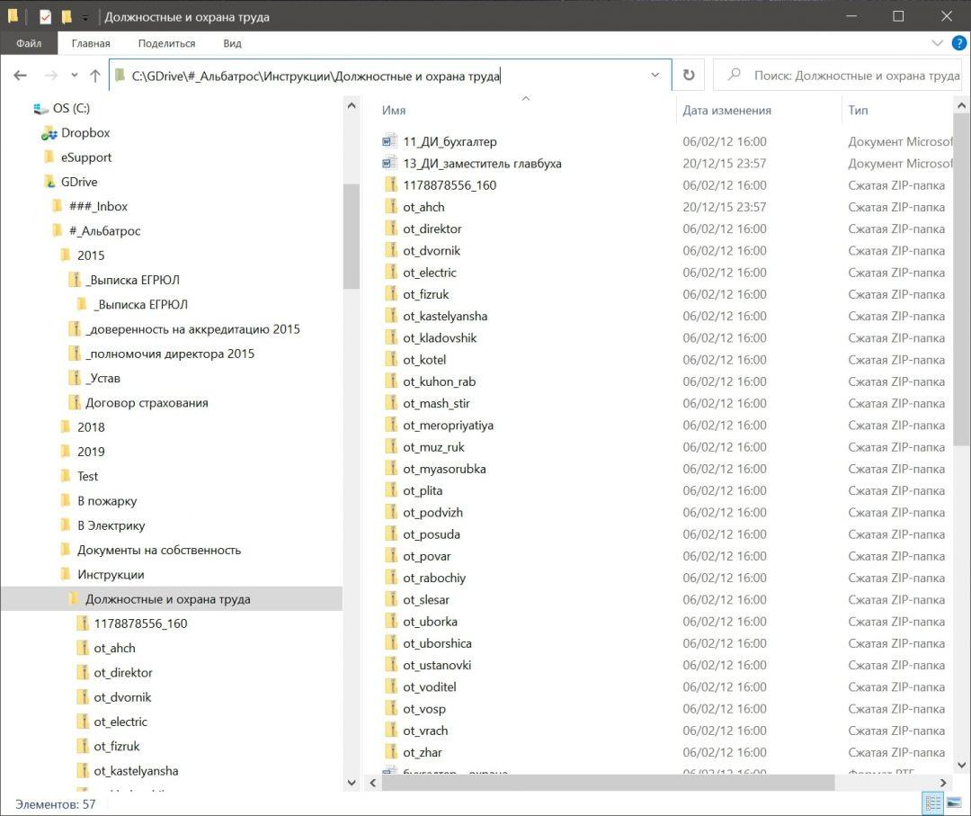 Внутри папки GDrive есть ###_Inbox и #_Альбатрос, а внутри #_Альбатроса — десятки других папок. Если мы посмотрим на скриншот, то увидим, то должностная инструкция бухгалтера лежит с остальными файлами внутри папки Должностные и охрана труда, которая лежит внутри папки Инструкции.