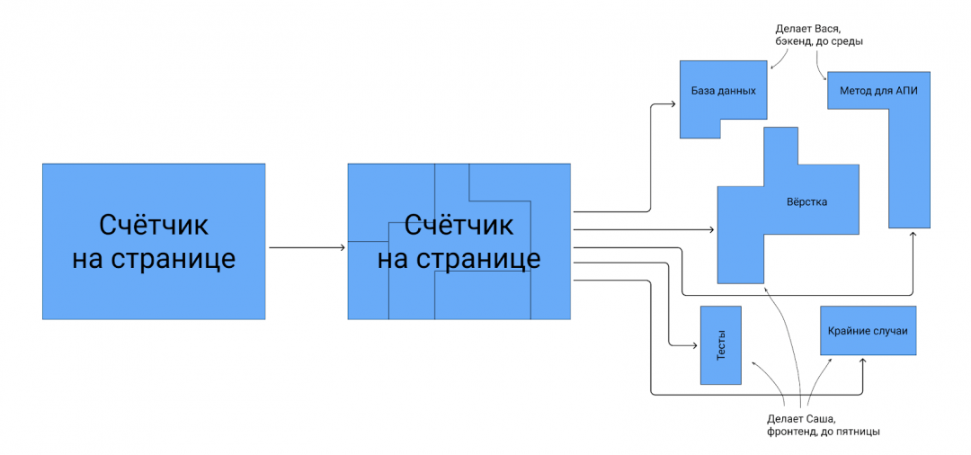 Чаще всего задачи раскладывают вертикально и горизонтально. Вертикально — значит по типам работ. Горизонтально — значит вглубь одного типа работы. Вот как это работает со счётчиком покупок в интернет-магазине:
