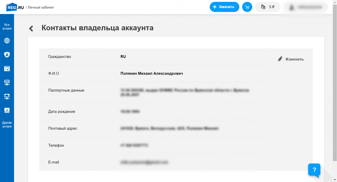 Паспортные данные или реквизиты компании. Перед оплатой сервис попросит ввести информацию о себе. Это нужно для того, чтобы регистратор имён знал, с кем он заключает договор и кому предъявлять претензии в случае нарушения закона. Весь остальной интернет этого не видит, но если что — регистратор будет знать, кто отвечает за домен и как с ним связаться. Все свои данные можно посмотреть в личном кабинете регистратора:
