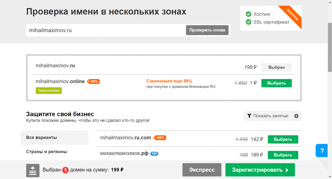 Подбор свободного имени. Там же на главной пролистываем экран немного вниз и попадаем в форму поиска доменов. Выберем название mihailmaximov.ru и проверим, свободно ли оно. Этот домен пригодится нам, когда мы будем делать полноценный сайт на основе страницы «О себе» на Бутстрапе. Сервис нам тут же предлагает купить второй домен за один рубль — спасибо, в другой раз:
