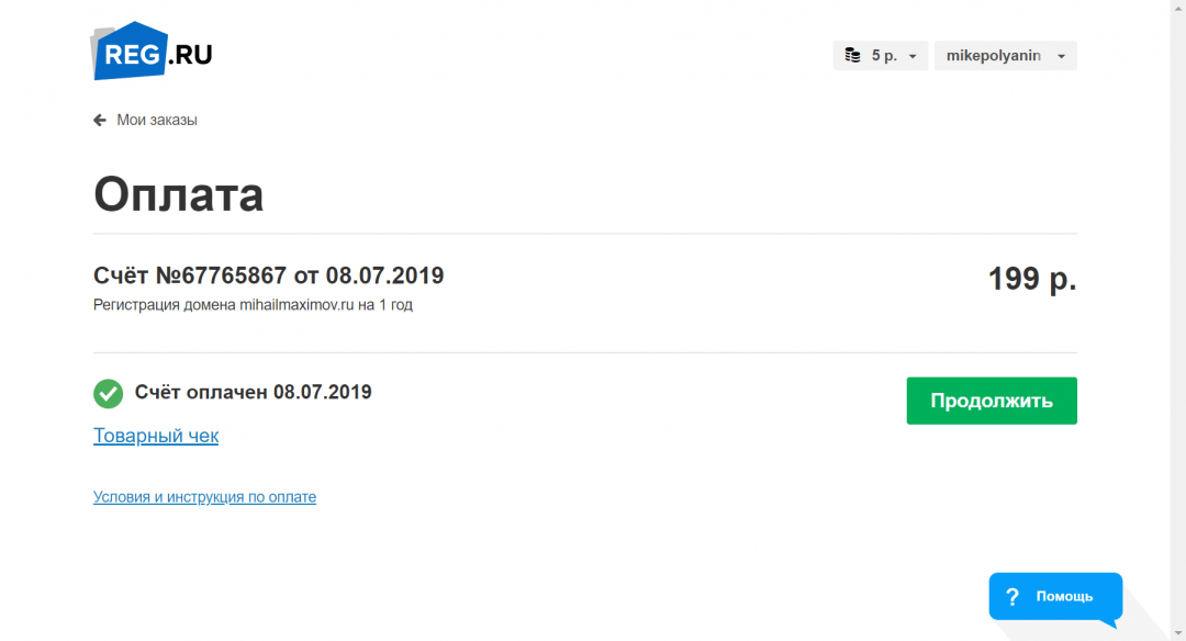 Если после оплаты видим такое или что-то подобное, значит, всё прошло хорошо, домен теперь наш: