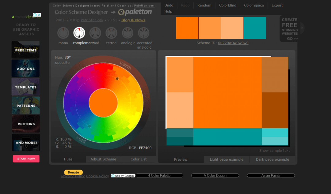 Похожий сервис, который подбирает палитру для вашего сайте на основе одного базового цвета. В сервисе есть выбор, какая палитра вам нужна, сколько должно быть акцентных и дополнительных цветов и так далее. Если ваша задача — найти цвета для сайта, которые сочетаются между собой, то начните с CSS Scheme Designer.
