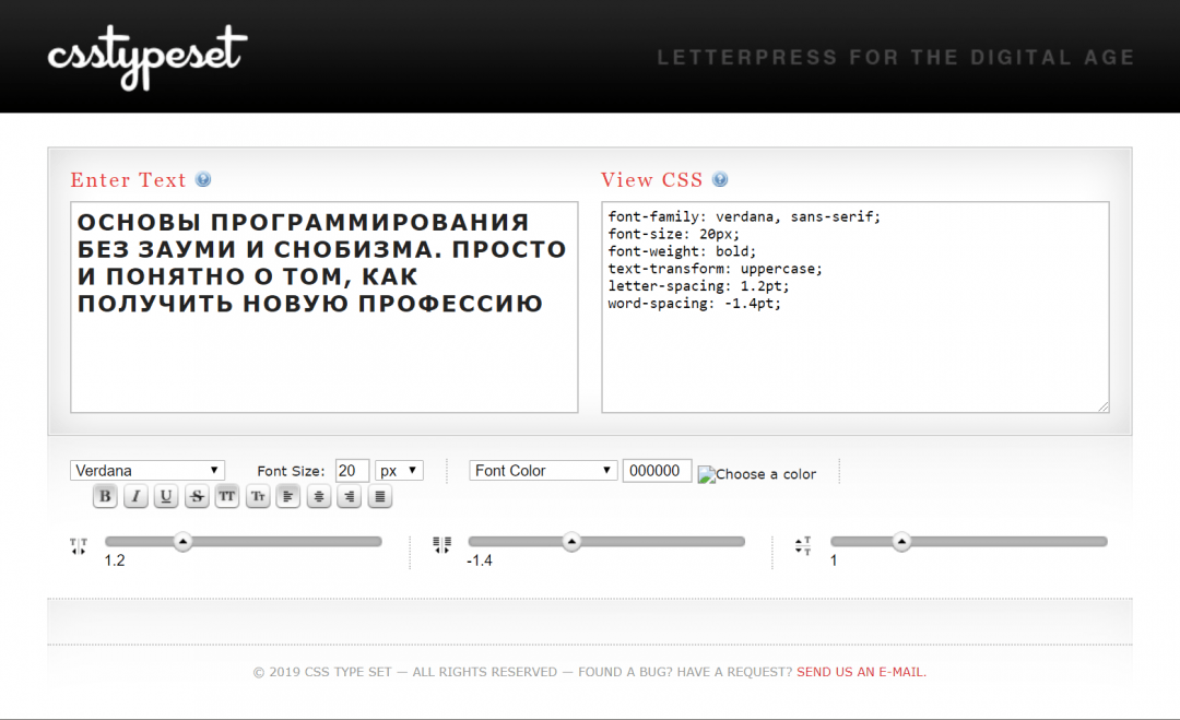 Сервис помогает быстро получить нужный код оформления текста. Он не умеет обрабатывать отдельные слова, поэтому применяет настройки ко всему абзацу. Из полезного — вы сразу видите результат и можете менять все настройки на ходу. Слева текст, справа — код, который отвечает за внешний вид текста. Его можно скопировать и вставить на свою страницу.