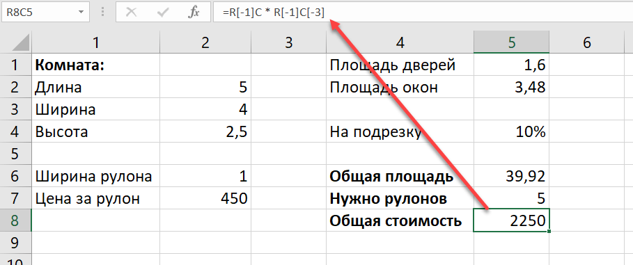 Ноль после точки с запятой означает, что нам совсем не нужна дробная часть и что нужно округлить до целого числа. Последнее, что нам осталось сделать, это посчитать стоимость всех рулонов. Для этого умножим их количество на цену: