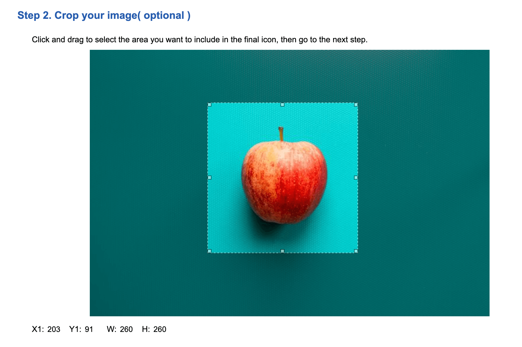 Если оставить картинку как есть, то фавикон получится странным: размер значка и так очень маленький, поэтому яблоко потеряется на фоне. Чтобы этого не произошло, кадрируем картинку — переходим ко второму шагу и мышкой выделяем нужный нам квадрат: