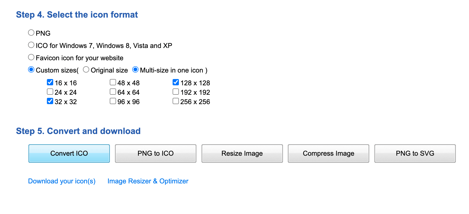 Дальше ничего не меняем и в самом конце выбираем три формата: 16×16, 32×32 и 128×128. Хитрость в том, что все три разрешения окажутся внутри одного файла и браузер в зависимости от настроек экрана выберет максимально подходящее для него.