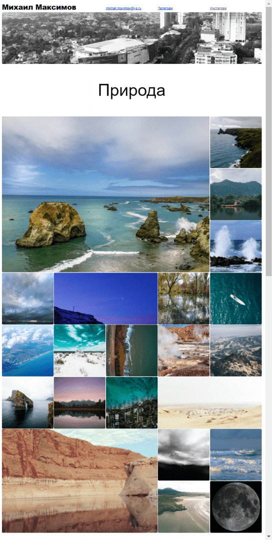 - ещё ниже идут фотографии, заполняя всю ширину макета. Какие-то фотографии больше, какие-то меньше;