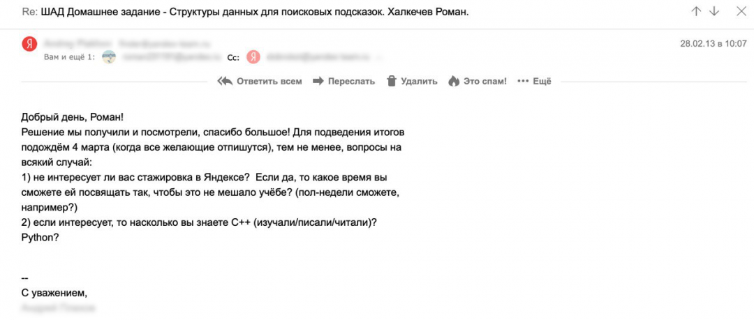 Решение я отправил за пару дней до дедлайна. В ответ мне предложили подождать дедлайна, чтобы определить победителя, но сразу задали два вопроса: рассматриваю ли я стажировку в Яндексе и умею ли программировать на C++ и Питоне.