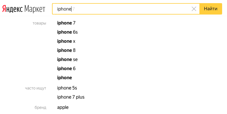 Мы развивали подсказки во всех сервисах, кроме гео: в поиске, картинках, маркете, музыке. Например, в маркете добавили в подсказки разделы: можно искать по бренду, по товарам или по частым запросам.