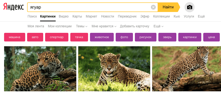 В изображениях реализовали связанные запросы. Например, если пользователь ищет «ягуар», то ему по умолчанию показывают животное. Но вдруг он ищет автомобиль или напиток? Эти варианты мы выводим в отдельный блок, так что пользователь может сразу уточнить запрос.