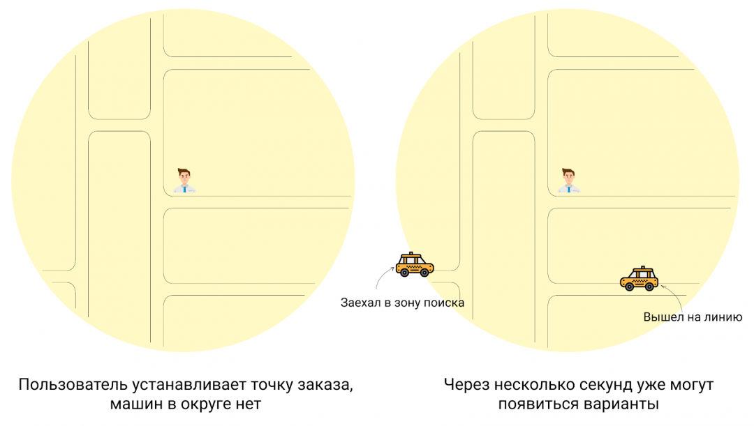 Раньше было так: если в определённом радиусе от точки вызова не было ни одного доступного таксиста, то приложение даже не начинало поиск, появлялось сообщение: «Нет свободных машин».