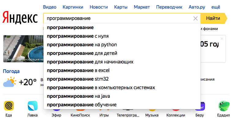 Поисковые подсказки — это популярные варианты запросов, которые поисковик предлагает пользователю, когда тот что-то ищет. Например, забиваем в Яндексе «программирование» и он предлагает «программирование с нуля», «программирование на python» и так далее. Это нужно, чтобы сэкономить пользователю время или помочь сформулировать запрос.