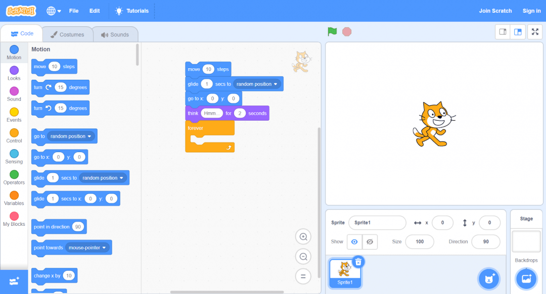 Scratch — учебная платформа по программированию для детей, тоже с визуальным программированием. Задача проекта — управлять котом, который может сделать всё, что предусмотрено программой. Слева сгруппированы команды для кота: движения, действия, условия. Посередине — программа, которую вы создаёте, перетаскивая мышкой нужные блоки. Результат можно увидеть справа — там кот начнёт двигаться и выполнять всё, что вы ему сказали.