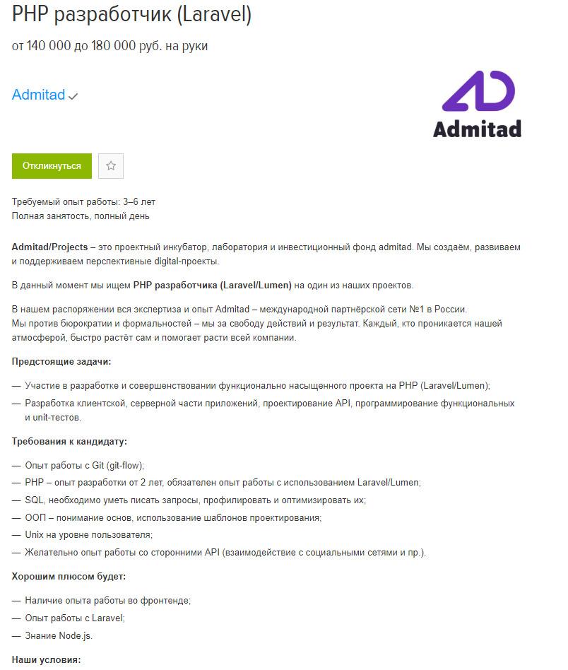 Допустим, вы уже долго читаете Код, прошли курс Практикума по веб-разработке и решили найти работу по профилю. Вы открываете сайты с вакансиями, пишете «разработчик» и находите такое объявление. Судя по тексту, знание Laravel — это ключевое требование к соискателю. Давайте выясним, что это такое, зачем оно нужно и что ждать от проекта с такими особенностями.