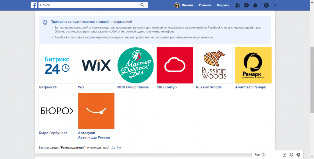 Там много разделов и блоков, можно зависнуть на несколько часов, рассматривая себя с точки зрения социальной сети. Например, если зайти в раздел «Рекламодатели и компании», вам покажут те компании, которые сами загрузили в Фейсбук данные о вас и используют их в рекламе:
