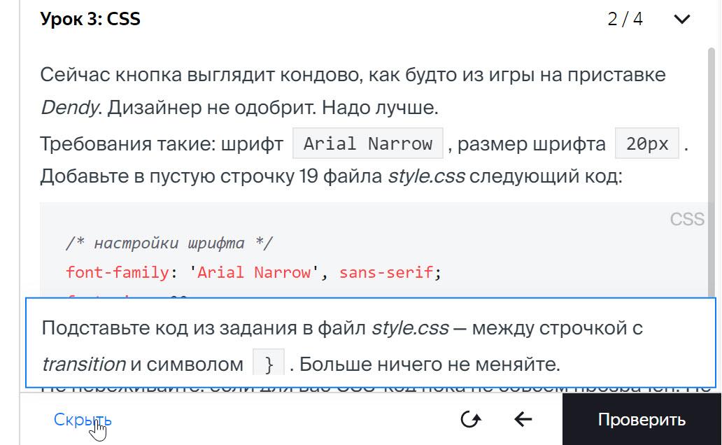 Все задания выполняются в тренажёрах: вы пишете код и тут же видите изменения на странице или результат работы программы. Задания можно делать сколько угодно раз, пока не получится.