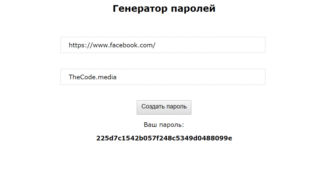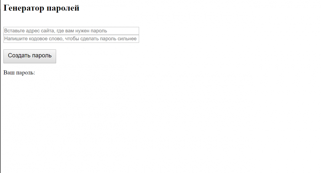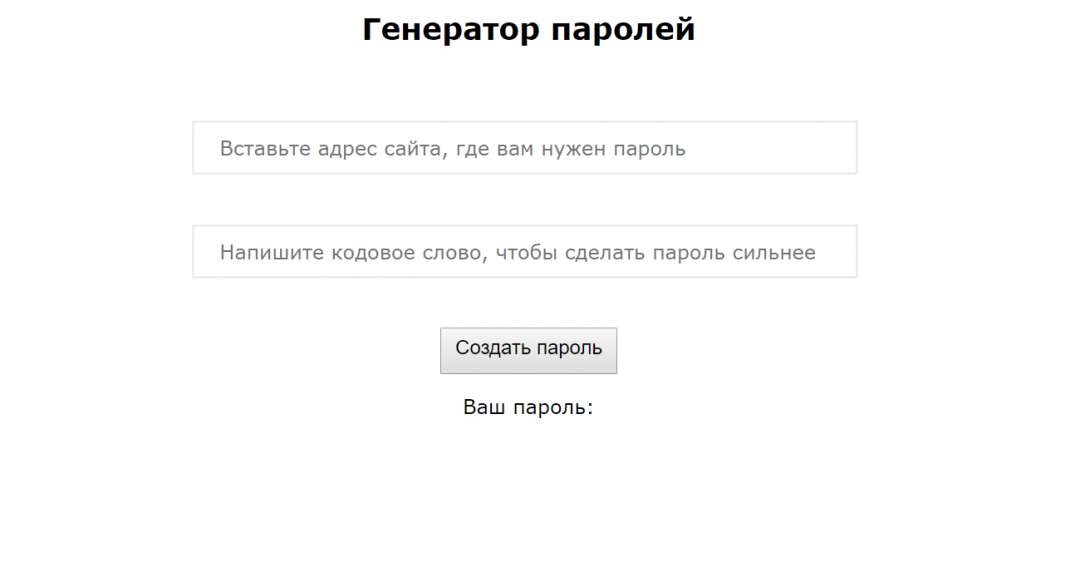 В этом уроке мы создадим страницу, которая будет генерировать пароли для любых сайтов. На входе вы будете давать ей адрес сайта, а на выходе она даст вам безопасный уникальный пароль. Безопасность будет достигаться за счет секретного слова и особого алгоритма шифрования. Также вы сможете вспомнить пароль от любого сайта, если знаете секретное слово и адрес сайта.