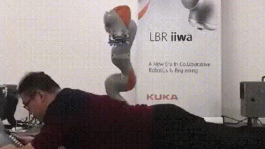 🧐 Что это: робот-массажист на базе манипулятора KUKA LBR iiwa, который умеет не просто разминать мышцы, а находить и разминать болевые точки — как настоящий массажист. Для более приятного воздействия на конец манипулятора прикрепили шарик. Робот умеет контролировать силу и скорость нажатия, так что переломы во время сеанса никому не грозят.
