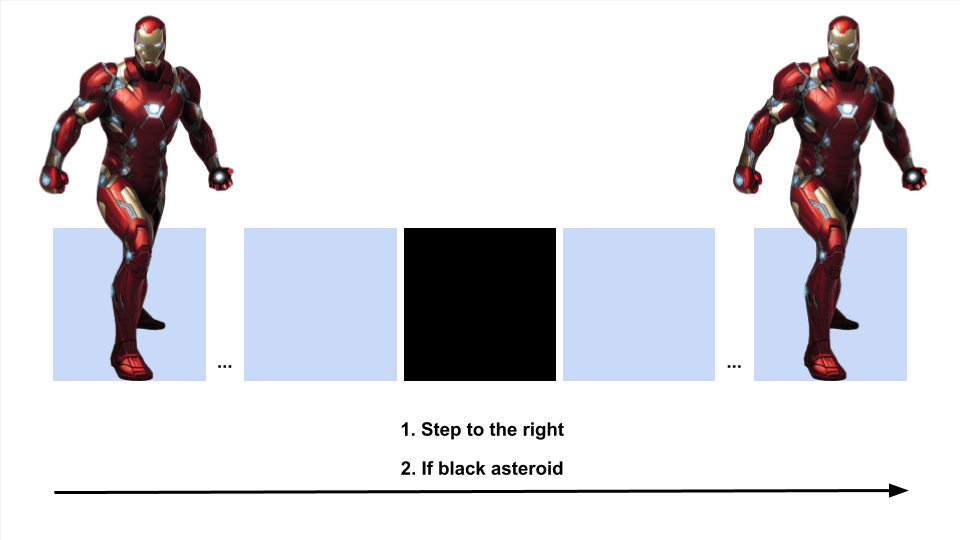 До встречи с чёрным астероидом оба костюма двигались с одинаковой скоростью — они проходили один астероид за две секунды: одну секунду занимала первая команда (Step to the right) и одну секунду — вторая (If black asteroid). Теперь эту скорость сохраняет только один костюм — тот, что не встретил чёрный астероид.