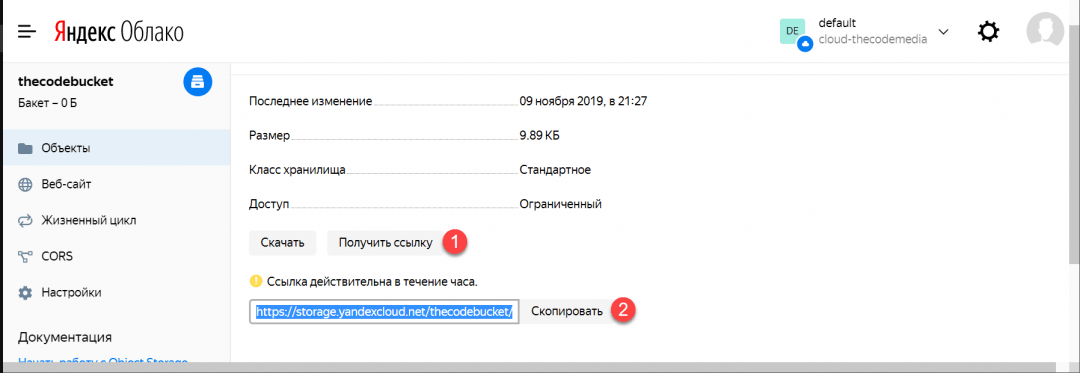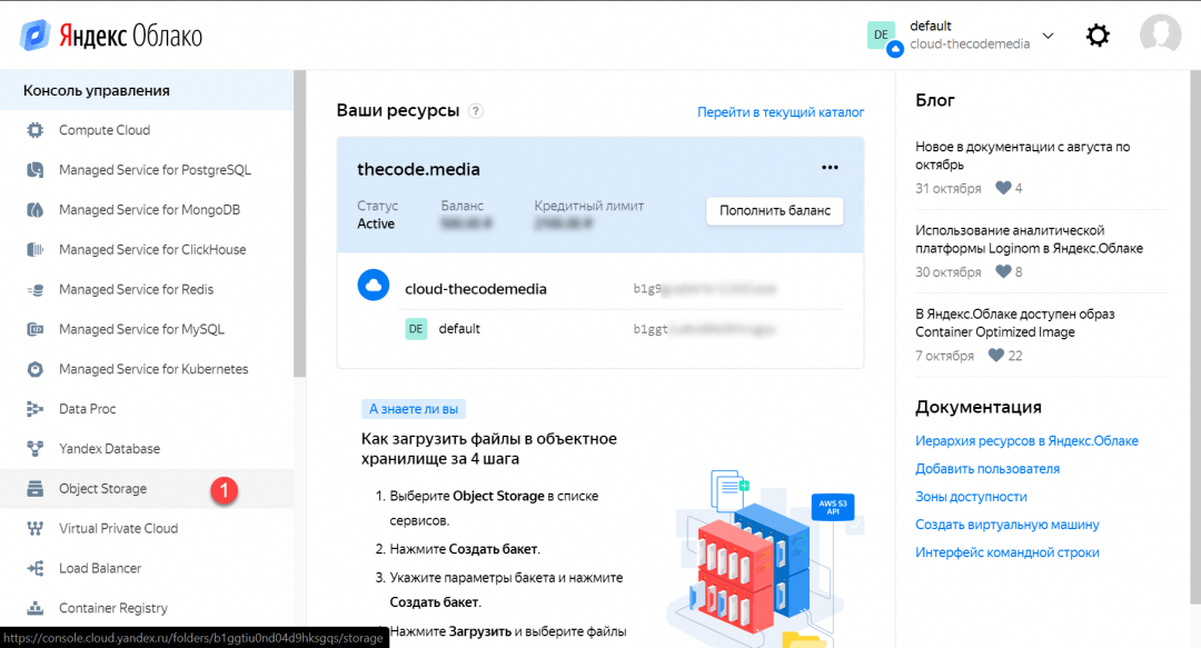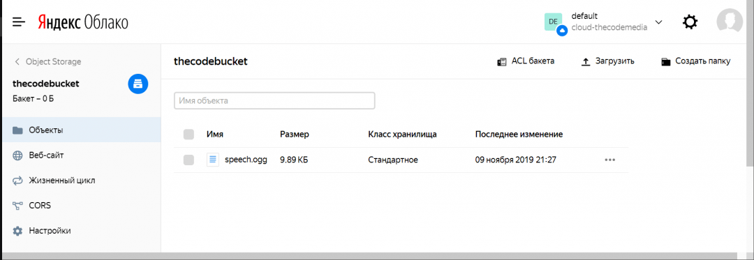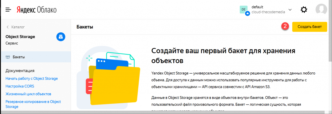 Теперь нужно готовый файл отправить в «Яндекс.Облако». Место, где хранятся файлы в облачном сервисе, называется «бакет» («ведро» по-нашему). Чтобы сделать новое ведро, заходим в консоль, переходим в раздел Object Storage и нажимаем «Создать бакет»: