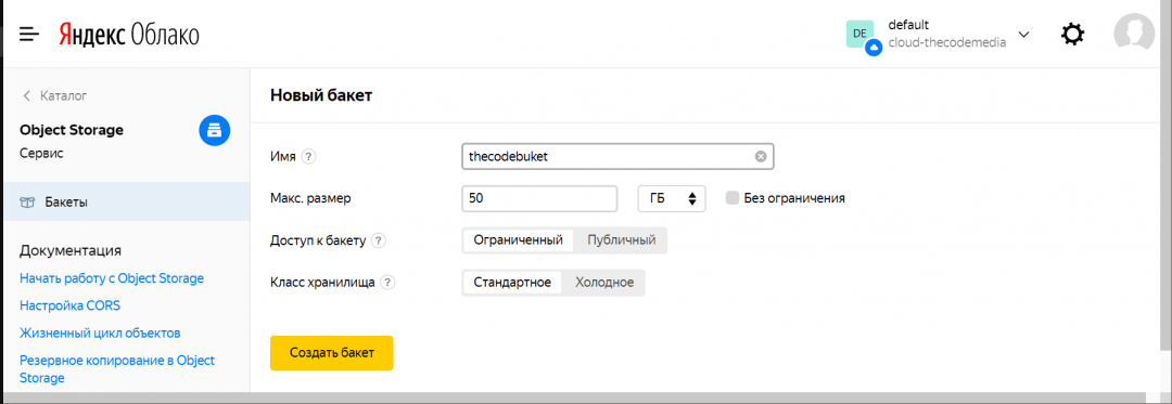 В появившемся окне придумываем имя и нажимаем «Создать бакет»: