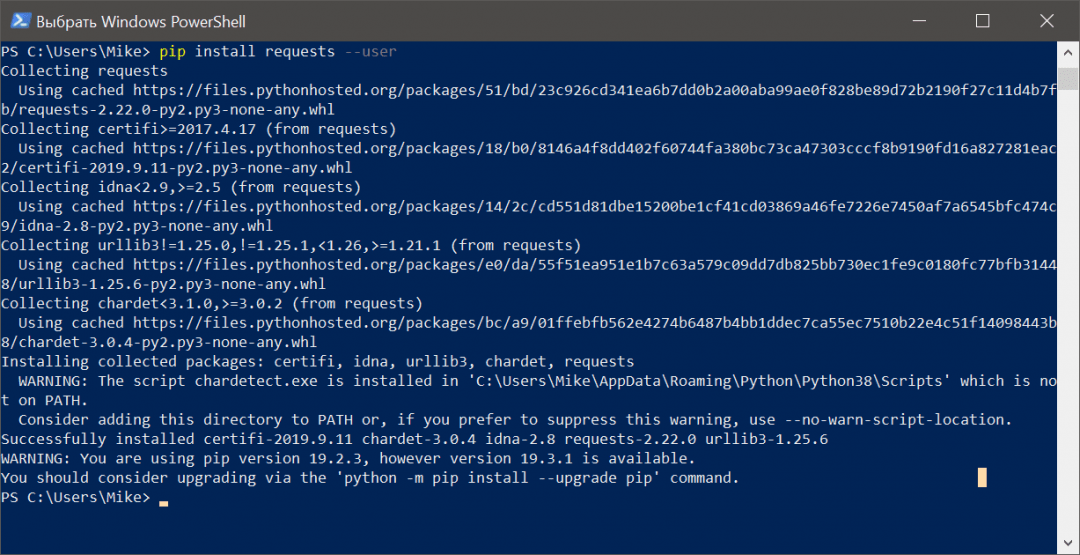 Чтобы отправлять запросы на сервер и принимать в ответ готовый текст, нам нужна python-библиотека requests. Установим её из командной строки в PowerShell. Если у вас Мак — то через Терминал: