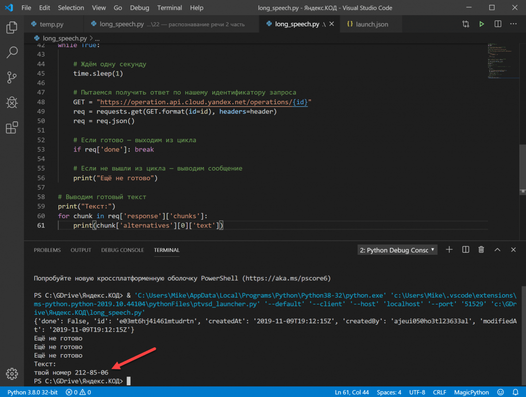 Эти данные мы вставим в наш код на Python. Логика программы простая: подготавливаем все данные и отправляем запрос на распознавание. Пока сервер не ответит, что всё готово, ждём. Как только приходит ответ — выводим готовый текст на экран.