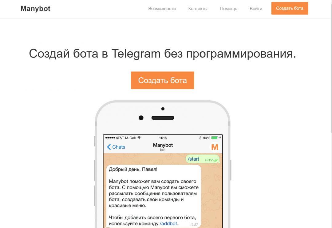 Manybot — единственный сервис в нашей подборке, где нет визуального конструктора, а вся работа идёт через телеграм-чат. Сервис подойдёт тем, кому нужны простые и предсказуемые диалоги, выбор из небольшого числа вариантов и маленькое меню. Вряд ли он подойдёт для серьёзных проектов, потому что проще выучить Python, чем управлять сложным ботом через команды в чате.