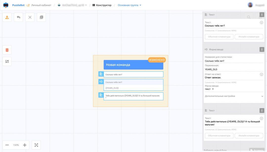 Это самый крутой по возможностям сервис, который мы тестировали. Если в PuzzleBot и Botmother мы могли делать почти всё, то здесь мы можем делать всё. Без шуток, здесь есть переменные, объекты как в ООП, функции и прочие программистские штуки.