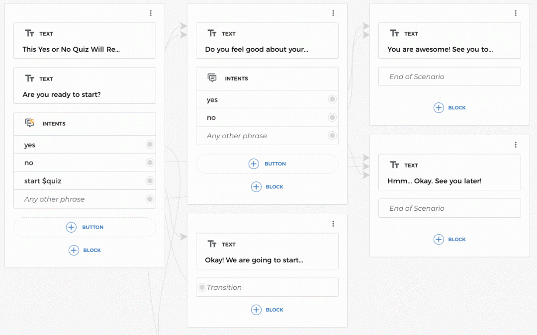 Мультиплатформенный конструктор помогает создать бота, который может работать одновременно в Телеграме, Вайбере и во ВКонтакте. В отличие от предыдущего сервиса, здесь есть блоки, которые можно перетягивать мышкой и настраивать связи между ними.