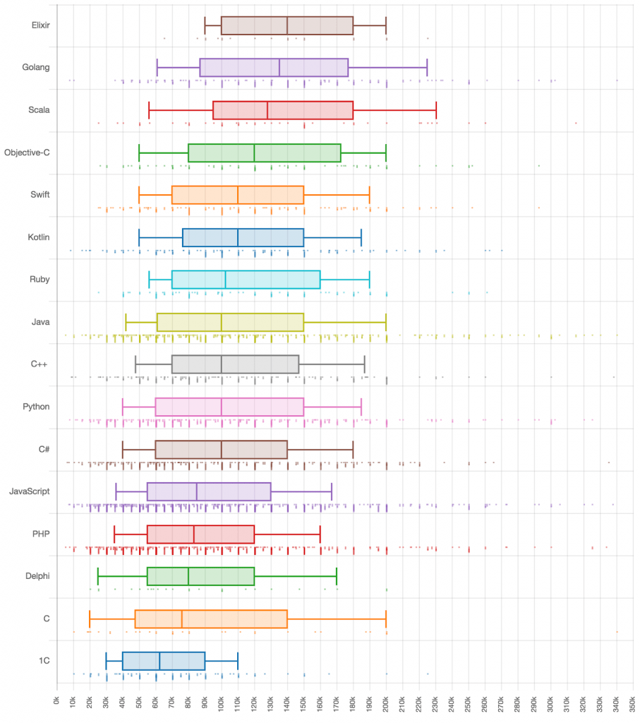 Сразу видно, что максимум денег приносят Elixir, Golang и Scala, потом идут Objective-C и Ruby. Не боитесь сложностей — учите Scala, хотите быть в тренде — Golang вам в помощь, любите простоту и ООП — начинайте с Ruby.
