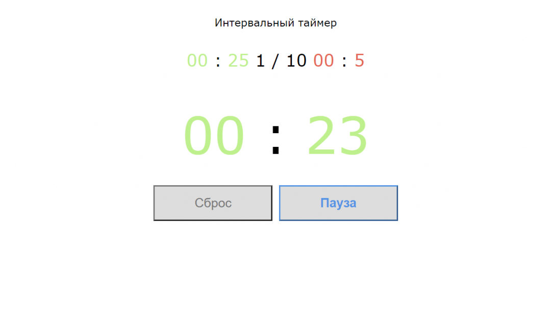 Теперь очередь кнопки «Пауза». Она появляется в тот момент, когда мы нажимаем на кнопку «Старт», которая сразу исчезает. Логика чуть другая: при каждом нажатии мы просто останавливаем интервал и тоже включаем звук, чтобы обозначить смену режима: